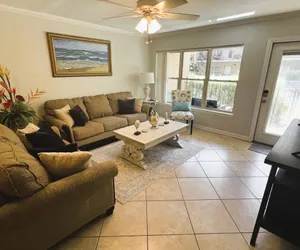 Eat, Beach, Sleep, Repeat**Practically Beachfront — Without the Beachfront Price!Why pay beachfront prices when the beach is literally steps away? Enjoy a short walk to the BAYSIDE entertainment zone for live music, great food, ferris wheel, go carts and much more or enjoy one of the ISLAND'S newest pickleball courts. This beautifully furnished 2-bedroom, 2-bath condo is located directly across the street from a beach access, offering gorgeous beach views and effortless ocean days—no long walks, no hauling gear for blocks.Spend your mornings on the sand, your afternoons swimming in the ocean, and your evenings unwinding on the gated poolside patio, drink in hand, reliving the day’s adventures...YOUR SpaceDesigned for comfort and easy coastal living, this condo comfortably sleeps up to 6 guests and is perfect for families, couples, or friends traveling together. Primary Bedroom: Queen-sized bed, private en-suite bathroom, TV, and a lovely view of the lush pool area Guest Bedroom: Two full beds, TV, and easy access to a full neighboring bathroomLiving & EntertainingKick back in the open, spacious living area featuring a flat-screen TV and plenty of room to relax after a beach day. The dining table seats six—perfect for family meals, game nights, or planning tomorrow’s adventures.Stay active during your getaway with access to a private pickleball court, perfect for morning rallies or evening matches.The fully equipped kitchen is ideal for entertaining, with: