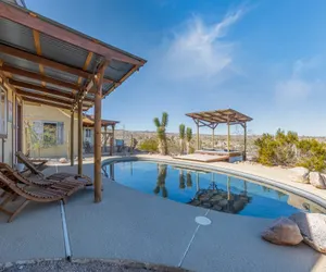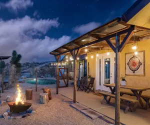 Make yourself at home at Lunar Vista Ranch, a stylishly, cozy property that trades the hustle of the city for mountain views and poolside lounging.This five-acre property is curated for those who want a curated outdoor experience without leaving home; you can challenge friends to a round on the private 9-hole disc golf course or spend a slow afternoon lounging by the pool. As the desert air cools, the hot tub becomes the best seat in the house for stargazing, offering an incredible view of the night sky.