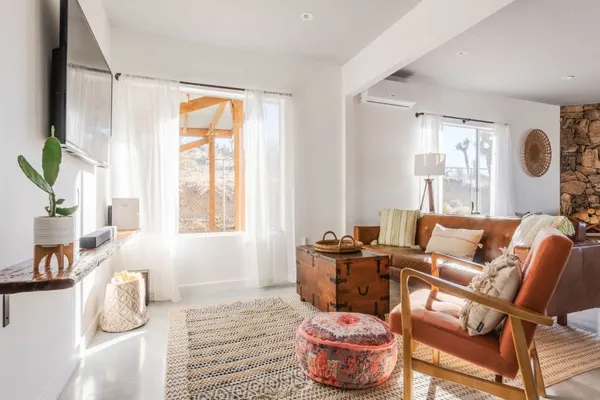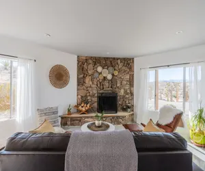 The home's interior is bright and sophisticated, featuring clean lines and comfortable spaces that make it easy to transition from morning coffee to evening cocktails. Outside, the patio is set up perfectly for a BBQ dinner or a night spent gathered around the fire pit. While you'll feel tucked away in your own private world, you're actually perfectly positioned for a quick trip into Joshua Tree National Park or a visit to the local galleries and cafes in the village. It's the ideal home base for a polished, seamless desert stay.