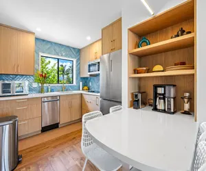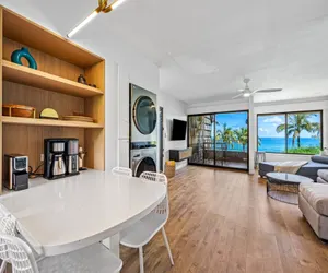 The open-concept layout feels spacious, with defined living, dining, and kitchen areas. Large windows and sliding doors bring in natural light and showcase the ocean. Cook with ease in the fully equipped kitchen, featuring everything you need for your stay. The dining area and living room open to the lanai for easy indoor-outdoor living.