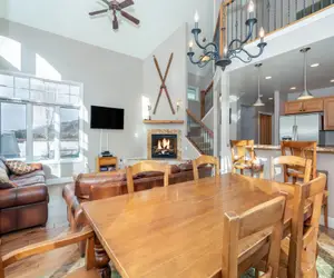 Upstairs on the second level of the home, the kitchen welcomes you with natural pine floors, stainless steel appliances, and granite countertops. The kitchen is open to the dining room and living room, making it a great space for the family or friends to hang out. The kitchen has a breakfast bar that seats three, while the dining area seats six. The living room has leather furniture, a gas fireplace, TV with Roku, DVD player, and stereo. There is also a small deck with a table and chairs off the dining area that affords a partial mountain view. Vaulted ceilings and big sunny windows create an open, airy feel.