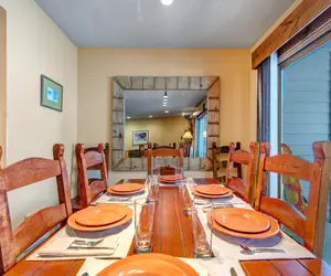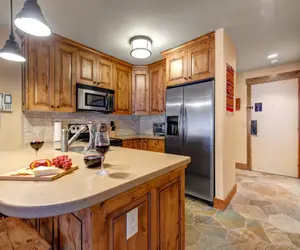 The well-equipped kitchen makes preparing meals effortless, featuring a convenient breakfast bar with seating for three, perfect for quick bites or apres ski gatherings. Just off the kitchen, a dining area with seating for 8 guests invites you to linger over home-cooked meals and share stories from the day’s adventures.