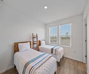 Upstairs, restful accommodations await. The primary suite features a king bed with a high-end memory foam mattress, luxury linens, and a private ensuite bathroom—your own serene escape. The guest bedroom offers two twin beds, each with quality memory foam mattresses and soft linens, ideal for family or friends traveling together.