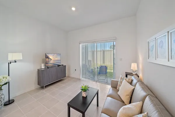 Step inside to discover a fresh, modern interior with all-new furnishings and an inviting open-concept layout. The main level seamlessly connects the living, dining, and kitchen areas, creating an ideal space to gather and unwind. Relax in the living room with a large SMART TV, or enjoy extra sleeping space with the queen pull-out sofa. The updated kitchen is fully equipped, making it easy to prepare everything from quick snacks to full meals. Sliding doors lead to a screened lanai and small private backyard, perfect for sipping coffee in the morning or enjoying Florida evenings surrounded by nature.