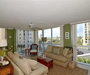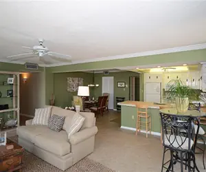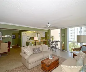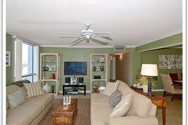 Unit 1046 is a spacious unit with a large living room and open kitchen, cream tile counter tops, green walls, a lovely tray ceiling and ceiling fan. There is a small round glass top bistro table found in the corner of the living room with a small view of the Gulf and there is also a nice view of the Gulf from the 2nd bedroom. The entire unit is ceramic tile with plush living room furniture and large wrap around windows in the living room. There is a king mattress in the master, and then 2 queens and a king in the third bedroom. There is also a washer and dryer for your convenience! This unit also includes 4 TV's, 3 DVD players, and an iPod dock for listening to your tunes!