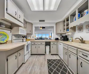 There is a king bed in the master bedroom and a king and one queen bed in the guest bedroom. All electric kitchen provides everything needed to cooking while on vacation and just staying in enjoying your unit. Open balcony with views of the Gulf of Mexico. The unit has a washer and dryer in the unit for your convenience. Shoreline Towers is centrally located within walking distance of 5+ restaurants, grocery store, pharmacy and shopping.