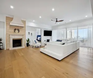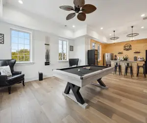 Guests will enjoy multiple indoor gathering spaces throughout the home, including a dedicated entertainment lounge complete with a pool table and bar area—perfect for relaxed evenings after a day on the beach. The entire top floor is designed as a recreation retreat, featuring a large open media and lounge space with sweeping ocean views and a full-size ping pong table that invites friendly competition. A full bathroom on this level adds comfort and convenience for extended game nights and movie marathons.