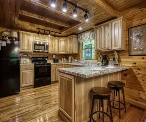 Enjoy the heart of the cabin in the fully equipped kitchen, thoughtfully designed with everything you need to prepare and serve delicious meals during your stay. You'll find all the essentials, including a refrigerator to keep drinks and snacks chilled, a stove for cooking hearty breakfasts or family dinners, a microwave for quick reheating, and a dishwasher to make cleanup effortless. With ample counter space and plenty of storage, you'll have room to spread out and stay organized while cooking. Start your mornings at the cozy bar seating for two—perfect for sipping coffee and easing into the day—while the dining table for four sits open to the living room, creating a seamless space for meals, conversation, and quality time together. Whether you're cooking a full dinner or enjoying takeout, this open layout keeps everyone connected. Dish towels, starter dish soap, and starter dishwasher pods are provided to help you settle in with ease.