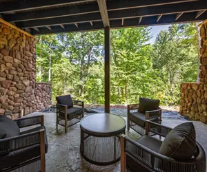 Step outside and breathe in the fresh mountain air while enjoying the peaceful wooded surroundings from the home's inviting outdoor spaces. The upper deck offers a comfortable outdoor sectional along with a table and seating for eight, creating the perfect setting for morning coffee, shared meals, or relaxing conversations surrounded by nature. Just off the master bedroom, a covered patio provides a quiet retreat with four chairs and a table, ideal for unwinding with a book or enjoying a peaceful moment away from the group. The lower-level patio, located off the game room, features beautiful stone walls that create a cozy and unique mountain setting, complete with four chairs and a table where guests can gather and relax between games or enjoy the fresh Smoky Mountain air. With multiple outdoor seating areas designed for both relaxation and connection, these thoughtfully designed spaces make it easy to enjoy the beauty and tranquility of the mountains throughout your stay.