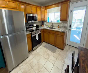 The kitchen and living room share an open space upstairs, creating a comfortable spot to relax after a day of fishing, boating, or exploring Port Isabel.