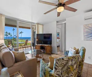 From your private lanai, take in memorable humpback whale sightings during whale season. The oceanfront primary bedroom offers a king bed, private bath, and direct lanai access, where gentle trade winds and the sound of the ocean create a restful retreat.