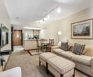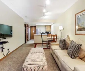 The primary bedroom features two comfortable queen beds, giving everyone plenty of space to relax after a day on the slopes. The living area includes a queen sleeper sofa, making it easy to accommodate additional guests.