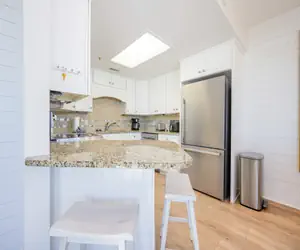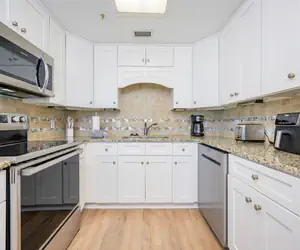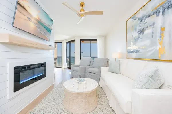 This condo has been completely updated with stunning flooring throughout, a modern kitchen with granite countertops, and the newest stainless-steel appliances. The breakfast bar includes two barstools, making it a great spot for quick meals or morning coffee. The living room is warm and inviting with a wall-mounted flatscreen TV and an electric fireplace—perfect for relaxing after a day at the beach.