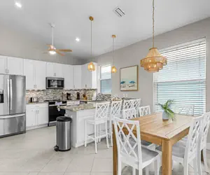 Outside, Pearl Paradise truly shines with its expansive pool area and inviting outdoor living spaces. Relax in the Florida sunshine on comfortable poolside loungers beneath umbrellas, or gather with family and friends under the covered patio seating area that offers comfortable seating for seven, perfect for relaxing and chatting in the shade. There is also a covered outdoor dining table with seating for six, creating a great space to enjoy meals outside in the warm coastal air. A grill is located downstairs for easy poolside cookouts and casual evenings outdoors.