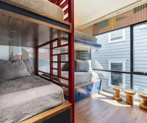The home highlights include: Two levels of open-concept living, designed for comfort and style. Decor with upscale, one-of-a-kind furnishings. Large master suite with a spacious walk-in closet and spa-style ensuite bathroom. The first guest bedroom is perfect for kids with 2 bunk beds, totaling in 4 full beds. The second guest bedroom has a queen bed and shares the full hall bathroom with the bunk room. The third guest bedroom has a queen bed with an en suite bathroom with a walk in closet.