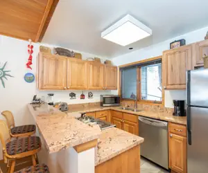 The open living and dining area creates a welcoming space for gathering, with seating for six at the dining table and three additional seats at the breakfast bar. The kitchen is fully equipped with granite countertops, stainless steel appliances, and essentials including a coffeemaker, toaster, blender, and microwave.