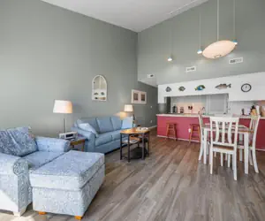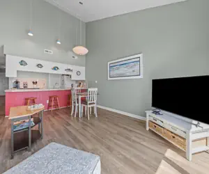 Step inside to an inviting open floor plan where the living, dining, and kitchen areas flow seamlessly together. The kitchen features ample counter space, making meal prep easy and enjoyable whether you're cooking a full dinner or preparing beachside snacks.