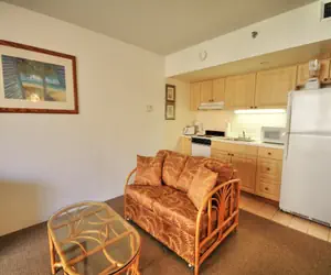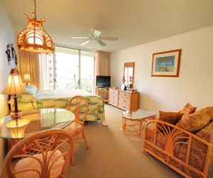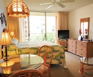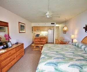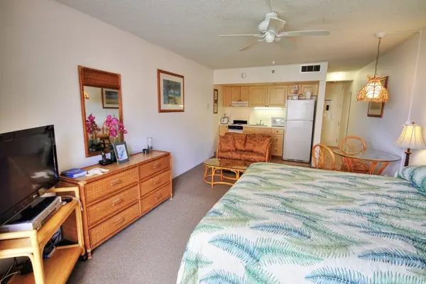 This third-floor oceanside studio offers a relaxing tropical view overlooking the pool and out toward beautiful Kahana Bay. Enjoy swaying palms, glowing sunsets, and in season, whale sightings right from your private lanai.