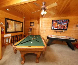 As the evening unfolds, gather around the cozy fireplace in the great room, or head to the game room for a spirited round of pool, air hockey, or a virtual adventure on the Nintendo Wii. The pièce de résistance is the private hot tub—your personal oasis for soaking under the starry sky, enveloped by the tranquil sounds of nature.