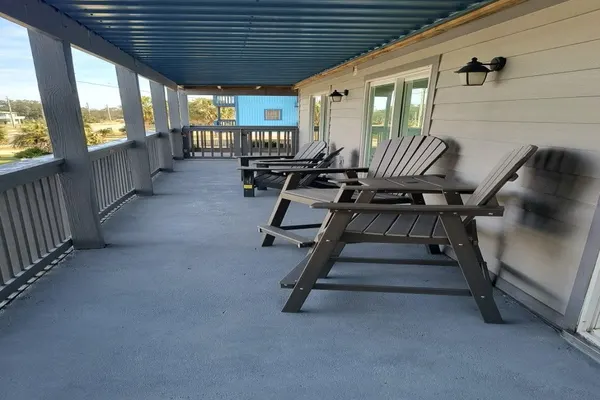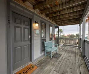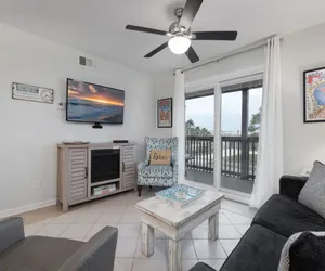 • Indoor-Outdoor Living: Sliding glass doors in the living area and both bedrooms open onto a roomy porch-style balcony. Relax on polywood patio furniture or sway on the porch swing while you sip morning coffee and watch sunrises over Little Lagoon.