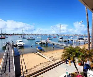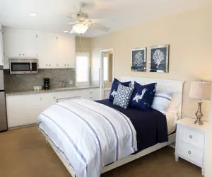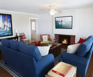 On the second level of the home there are two bedrooms that could both be considered master bedrooms with king sized beds and master bathrooms inside of them. There are two other bedrooms perfect for another couple with a queen sized bed and another one great for children or additional guests containing a bunk bed with a twin sized mattress on top and a full on the bottom. These two bedrooms share access to another bathroom. At the top of the stairs to the left, there is another large living room with plenty of seating and a wall of floor to ceiling windows you can open to enjoy the views and breeze of the beautiful harbor.