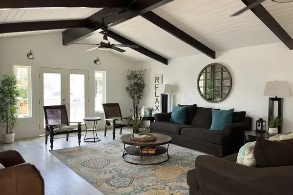 The home has 4 bedrooms, all upstairs. There is a master bedroom with a king bed, 2 guest rooms with queen beds and another guest room with a full bunk bed. All upstairs bedrooms share the bathroom in the hallway, there is also another full bathroom just down the stairs on the first floor next to the kitchen and dining area. The living room is cozy and has lots of seating, perfect for relaxing after a beach day or having a game night with the family. The living area opens out to the front patio where you can grill up meals or soak up some sun.