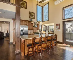 This luxurious 3,000 square foot, 5-bedroom, 3 1/2 bath, three-level home accommodates up to 10 people and is situated directly across from the ski slopes and has lots to offer all year round. Boasting premier finishes throughout and is fully equipped with all that is needed for a perfect stay! Enjoy two fireplaces, flat screen TVs in all bedrooms and living room, radiant heat, central humidifier, a large slope-facing deck with a barbecue grill and outdoor furniture. The private seven-person hot tub overlooks the slopes making it a perfect place to unwind after a long day of skiing or hiking!