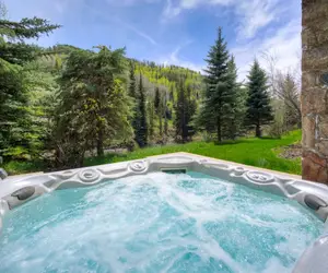 The master bedroom on the main floor features a king-size bed, while the top floor second bedroom has two queen beds and the third bedroom features a king. The fourth and fifth bedrooms on the lower level each have two twin beds, which are perfect for families with kids. Warm up by a stone fireplace after a long day on the slopes, enjoy complimentary Wi-Fi, & watch favorite movies on a large flat-screen TV. The main level features a terrace overlooking the creek, complete with a full outdoor dining set that seats 8 and gas grill. The lower level has the perfect area for hanging out, playing a game of pool, soaking in the outdoor private hot tub, and enjoying a few cocktails from the wet bar.