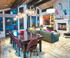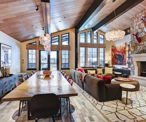 This luxury four-floor home is suitable for up to sixteen guests and offers nearly 5,200 square-feet of space, a private entrance, and floor-to-ceiling views of Vail Mountain's Gondola One and the Gore Mountain Range, as well as a large furnished balcony.