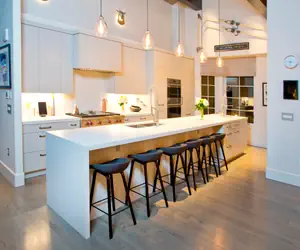 An attractive gourmet kitchen with stainless steel appliances and a dining table for ten awaits homemade meals, après ski gatherings, and chef-catered meals.