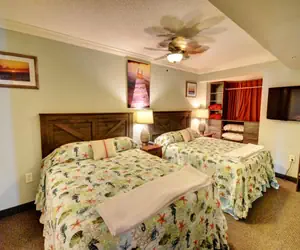 The second bedroom is furnished with two XL Full beds and a TV.