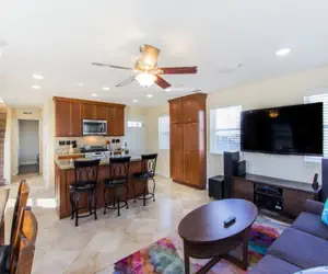 The home opens up to the open living, dining and kitchen area. Perfect for gathering the crew after long beach day to relax. Just past the kitchen you will find a laundry closet with a stacking washer and dryer. Following that, you will find a full bathroom and a guest room with a queen bed. Up the stairs you will find the master suite with a walk in closet and an en suite full bathroom. This master suite also has access to a full roof top deck with a BBQ and a dining table to enjoy meals with a beautiful sunset view.
