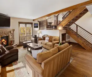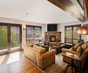 This luxuriously contemporary unit has an upscale open-air tree-house feel to it, with its hidden alcoves, prominent centralized staircase, secret rooms, and various treasures. It’s bright, airy, and spacious. Upon arrival, you’re ushered up to the ski/mud room. The main level boasts a great room with high ceilings and ample light. The granite stone hearth gas fireplace, unpredictable and uniquely charming furnishings, and dark hardwood throughout make this earthy haven warm and welcoming. Downstairs there’s an extra den/bedroom. Upstairs a hidden loft. It exhibits a splendid scenic extravagance, with stunning Aspen-studded views of the valley. The French doors in the gourmet kitchen open out onto an expansive balcony, designed to entertain both inside and out on those sunny Colorado days.