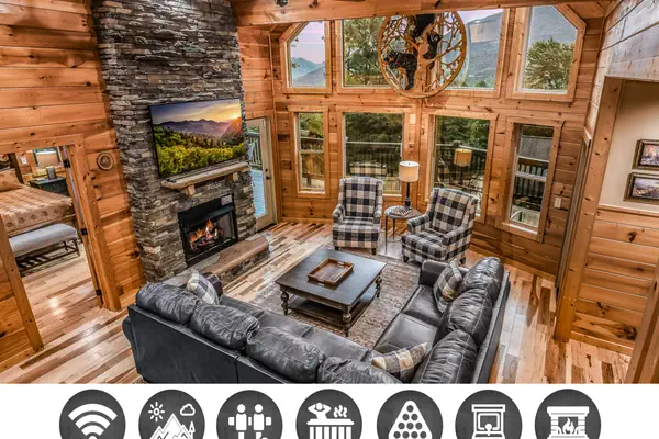 Escape to the serene beauty of the Smoky Mountains and unwind in the cozy comforts of Bearmont Lodge in the heart of Wear's Valley, Tennessee! This stunning 4-bedroom, 3-bathroom cabin retreat sleeps 12 guests in comfort. This picturesque cabin offers breathtaking views of the surrounding mountains and forest. As you step inside, you'll be greeted by plush furnishings, a warm stone fireplace, and plenty of natural light pouring in through large windows. The open-plan living area is perfect for gathering with family and friends, while the fully-equipped kitchen is ready to whip up a feast. There is reliable WiFi throughout the cabin to keep you connected. With its private hot tub, fire pit, and outdoor seating areas, this retreat has everything you need for a relaxing getaway. Come and experience the best of the Smoky Mountains with Bearmont Lodge!