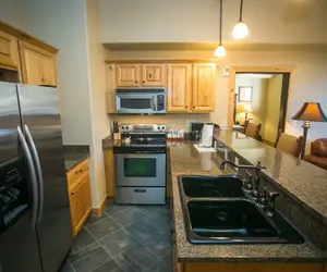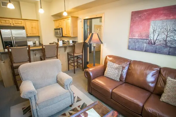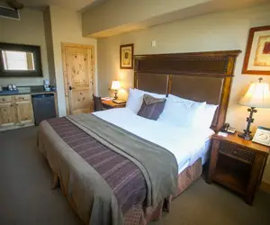 This one bedroom suite offers a full kitchen and living space with amazing mountain views. The bedroom features a king size bed with a fireplace.