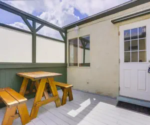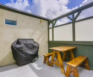The entry patio deck has a table for four and a brand new BBQ grill for cooking.