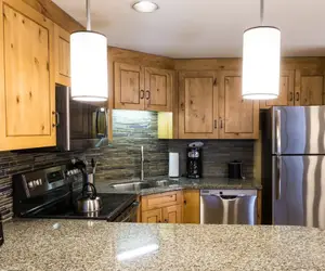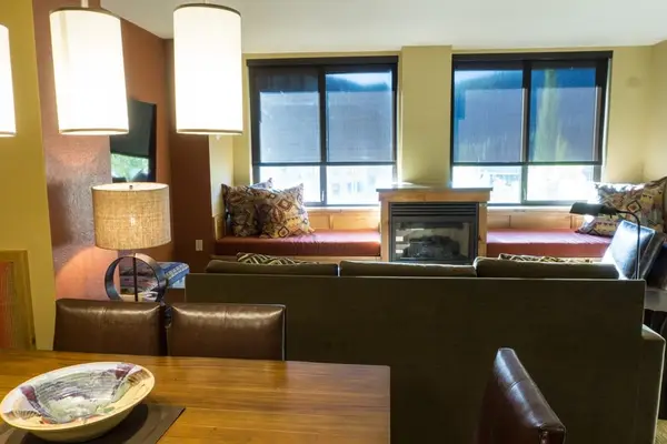 • One Bedroom suite features a full kitchen with living and dining space. Sleeper sofa and 2 daybeds offer additional space for people to sleep. With a spacious living area, a full-sized kitchen, and dining space for 4 people, your dream of experiencing mountain luxury becomes a reality. Additional amenities include in-building washer and dryer, a living area with exceptional views, daily housekeeping, underground parking, a dry sauna, and conveniently located footsteps away from the Orange Bubble Express.