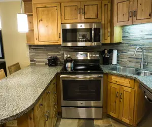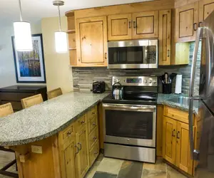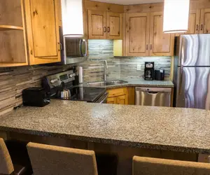 One Bedroom suite features a full kitchen with living and dining space. Sleeper sofa and 1 daybed offers additional space for people to sleep. With a spacious living area, a full sized kitchen, and dining space for 4 people, your dream of experiencing mountain luxury becomes a reality. Additional amenities include in building washer and dryer, a living area with exceptional views, daily housekeeping, underground parking, a dry sauna, and conveniently located footsteps away from the Orange Bubble Express.