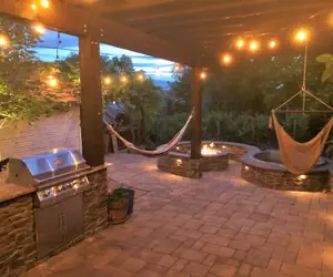 The back yard is one of the nicest back yards you will ever step foot in. It has an outdoor theater area with a 120" theater projector, complete with hammocks and hammock chairs to sit in while watching. There is a covered outdoor dining area, an outdoor kitchen area with a sink, refrigerator, and premium built-in grill. There is a gas fire pit with stone seating all around it that sits right next to the small below-ground hot tub that seats 3 people, maybe 4 and has plenty of hammock and bench seating around it, allowing everyone to hang out together. In addition to the covered patio, there are two pergolas and a small private vineyard in the back yard.