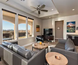 Fish Rock Retreat is a 2,434 sq ft luxury home located at The Ledges of St. George. This 3-bedroom, 3.5-bathroom home is set up to accommodate single or multi-family groups. The furnishings include all the upgrades you could ask for including flat-screen HDTV's, granite countertops, and stainless-steel appliances. The floorplan is open and welcoming with bedrooms that are quiet and private. Accommodations also include an outdoor gas grill, a covered back patio, and a private backyard.