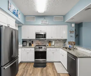 LOTS OF UPDATES! This updated oceanfront unit (10th floor) offers an open floor plan that sleeps up to 8 people. The views are breathtaking from the 40” gulf front balcony with three “sitting” areas that comfortably seats 10! Enjoy the large, well stocked kitchen, granite counter tops, tile backsplash and updated appliances (new fridge added 9/25). The living room has a queen sleeper sofa and love seat (2022), with big screen Smart TV which flows to the dining and bunk bed areas. (Your passwords and logins are needed for apps such as Netflix, Amazon Prime, Hulu, Pandora etc.) The primary bedroom includes a king bed, TV, sliding glass doors to the balcony, and bath with double vanity (new sinks, faucets, quartz countertop, mirror and lighting December 2024), glass enclosed walk-in shower, walk in closet, separate toilet room with comfort height toilet, and a designated laundry room. The guest bedroom has a king bed, TV, with connecting door to the guest bath which was completely updated December 2024 featuring new cabinets with, quartz countertop, sink, faucet, new tiled tub/shower combo with grab bars and comfort height toilet with pocket door separation. Recent flooring and paint throughout the unit provide an inviting cohesive look. Two beach chairs with umbrella ARE INCLUDED with your rental! All 2/2 units at Gulf Crest are the same size which the Tax Assessor lists as 1310 sq. ft. I recognize that you have many options for your vacation and I sincerely THANK my renters and repeat guests for choosing Unit 1002!