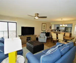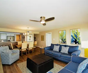 Inside, the condo offers a comfortable and inviting living space with a Fully Equipped Kitchen, ideal for preparing meals after a day at the beach. The primary bedroom features a king-size bed, the second bedroom also offers a king-size bed, and the third bedroom includes two extra-long full beds, comfortably accommodating families or groups. Two full bathrooms, a washer and dryer, cable TV, Wi-Fi, and garage parking add convenience and comfort to your stay.