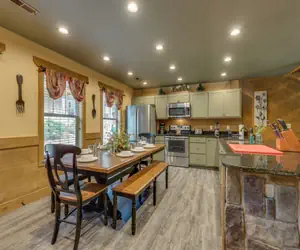 The fully equipped premium kitchen boasts stainless steel appliances, a breakfast bar, and mountain-inspired cabinetry, perfect for preparing gourmet meals. If you prefer outdoor cooking, the upper deck features a gas grill and a cozy dining area.