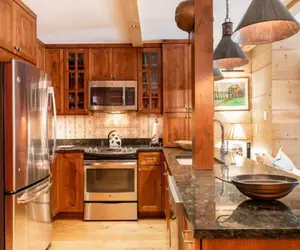 This town home backs up onto Gore Creek. One assigned parking spot in front of the unit. Recently completely remodeled and tastefully decorated. Stainless steel appliances and granite counter tops. The kitchen has everything you could possibly need for cooking and there is a large wood burning fireplace and a gas grill on the front deck. Bedding is king and two twins; queen bed; two twins. For stays of 1,2,3,4,5 nights a checkout cleaning fee of $250 will be added to the cost of any reservation. If you stay 6 nights or more, the checkout clean is waived. This residence does not have air conditioning.