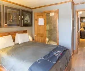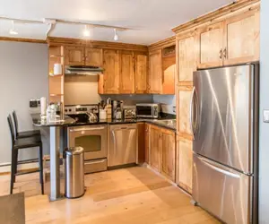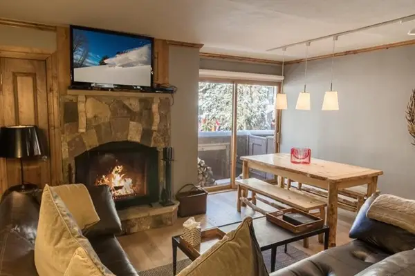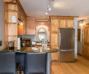 The condo features a bedroom with a queen and en suite bathroom; second bedroom has 2 sets of bunk beds, (4 twins); and the bathroom access is off the hall. Perfect for a family with children in ski school. New furniture throughout the unit and a wood burning fire place. Nicely appointed kitchen with everything you need to cook the family dinner. This residence does not have air conditioning.