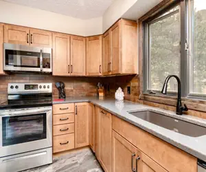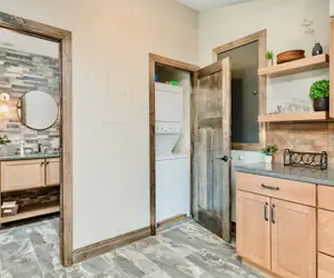 Sittin' Pretty – a premier luxury vacation home in Estes Park, Colorado – is stunningly situated on the ramparts of Ram's Horn Mountain and is part of prestigious Windcliff Estates. The entry to this rental home is flanked with a dramatic, ascending wall faced with Rocky Mountain moss rock: a harbinger of the beauty and relaxation that awaits you here.
