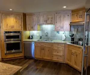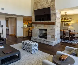 The Four Bedroom Penthouse units offer expansive, luxurious accommodations with a full-sized kitchen, dining, and living areas. The unit features a queen-size sleeper sofa, a gas fireplace, and 5 full baths. One of the bathrooms includes a steam shower, enhancing the spa-like experience. The penthouse has 4 bedrooms: three king bedrooms and a final bedroom with a 3-piece twin set. Additionally, there are two separate living rooms, one of which has a door that closes, ideal for large groups looking for some social separation, and includes a pull-out sofa. The large loft area includes an additional pull-out sofa, providing extra space for guests.
