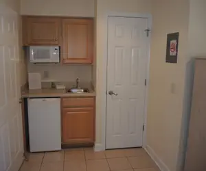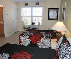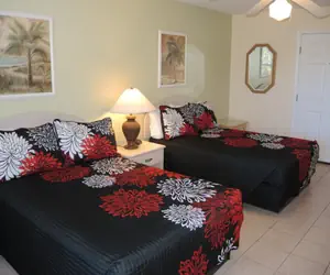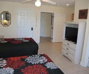 Our Studio Villa units can house up to 4 in two double or queen beds. The Studio unit has a bathroom, dorm style refrigerator, small microwave, coffee maker, place settings for 2 people and small dining table with 2 chairs. Each Studio does have a TV with cable and wireless internet for your convenience. This unit provides basic cable TV.
