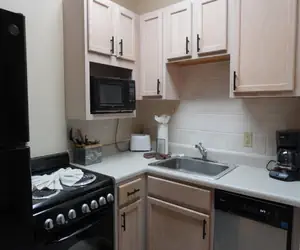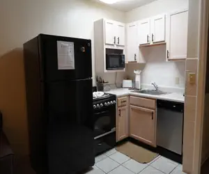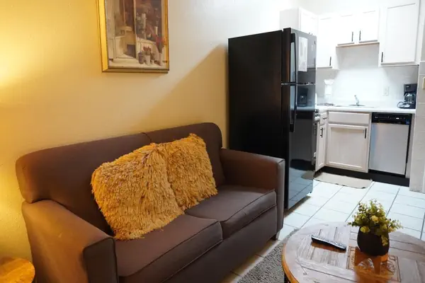 The kitchenette provides a refrigerator, stove/oven, coffee maker, dishwasher, and microwave.