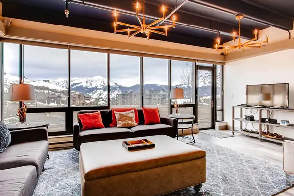 Please note that the resort fee is included in the rate you see. No Cleaning Fee! This magnificently designed 3BR/2BA ground floor residence was updated in 2016 with new flooring, lighting, furniture and more. The gourmet kitchen features a stainless steel refrigerator, six burner Jennair stainless steel oven, heated floors, new counter tops and back splash. A new table with seating for 8 completes the dining area, and there are 2 sofas in the living room accompanied by floor to ceiling windows with breathtaking views of Whetstone and Red Mountain. It has a remote location at the end of the building and has its own access door, which gives you the feel of being in a home vs. a condo. With this unique location, you'll have private access to the large shared patio with the horseshoe pit and grill with picnic tables right outside your door. After a long day of skiing or hiking, you'll have the option of soaking in a custom Jacuzzi tub in the master bathroom, or shared hot tub located just one door down from the unit. Full laundry facilities in unit. Sleeps 8 with a King bed, a Queen bed, and 2 sets of bunk beds. Indoor atrium entry access.
